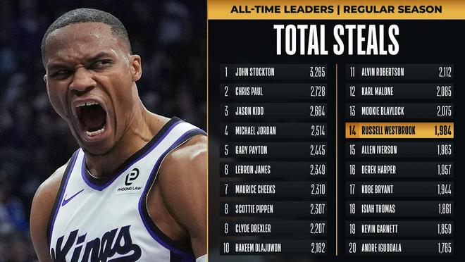 据统计,威少在本场比赛中拿到了生涯第1984次抢断,他也完成了对阿伦-艾弗森的超越,升至历史抢断榜第14位。